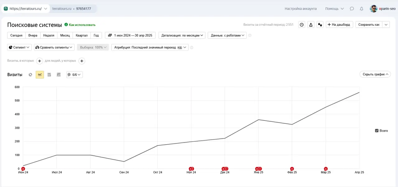 - Апрель 2025: 560 переходов в месяц — рост в 11 раз.