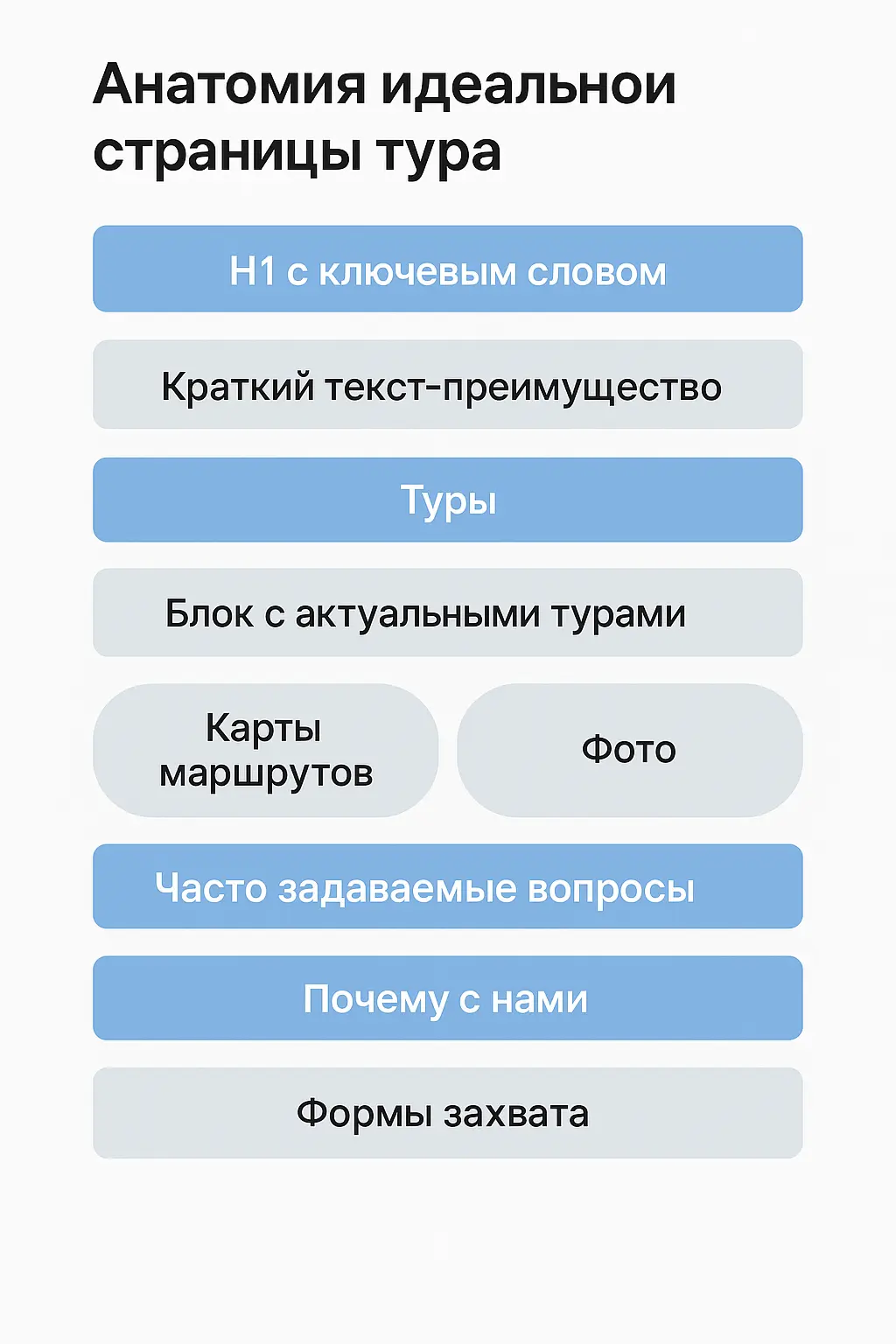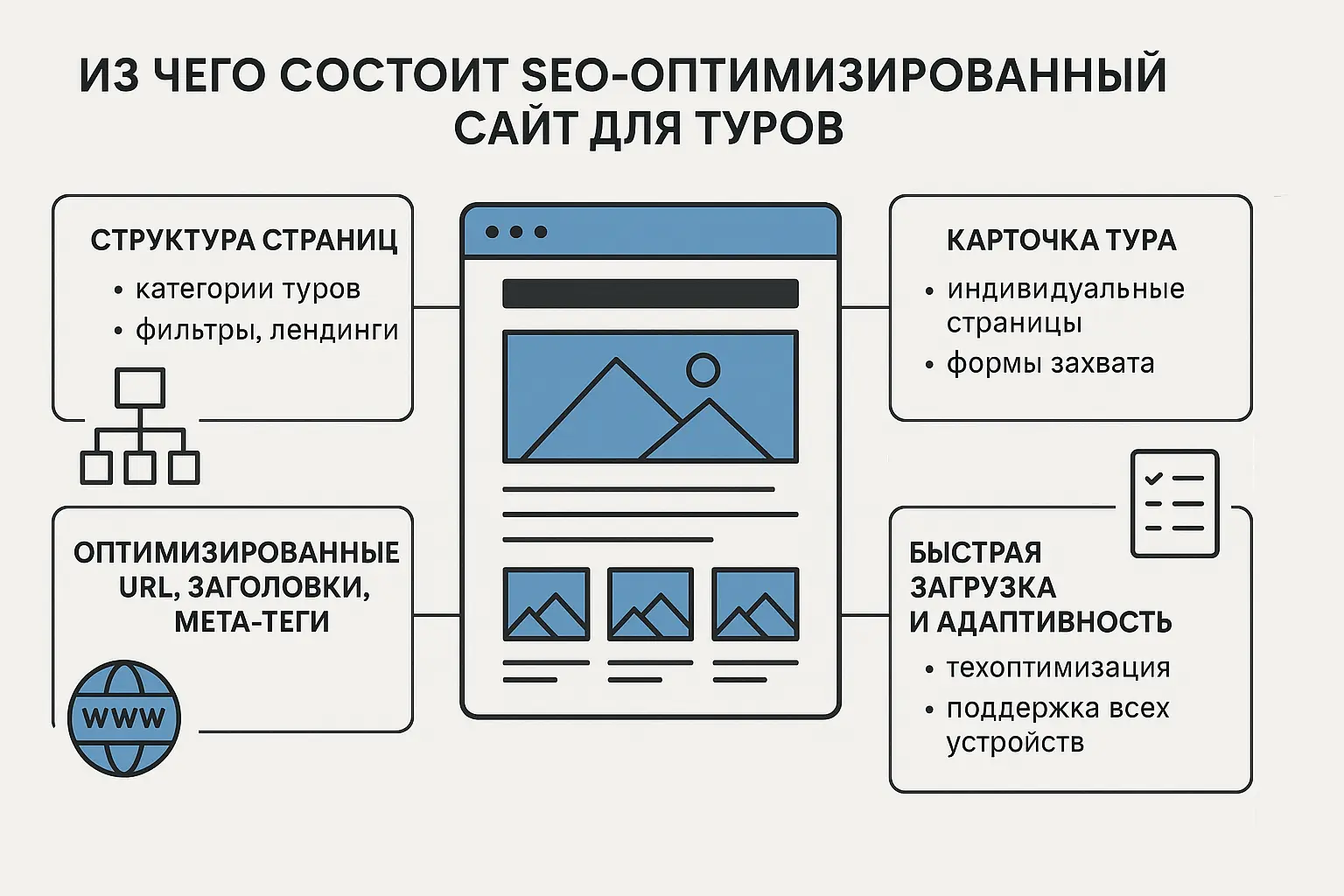 - Поддержка полноценной структуры страниц (категории туров, фильтры, лендинги под направления);