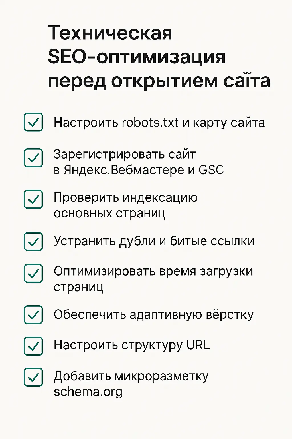 - Оптимизированные URL, заголовки, мета-теги — с ориентацией на целевые запросы;