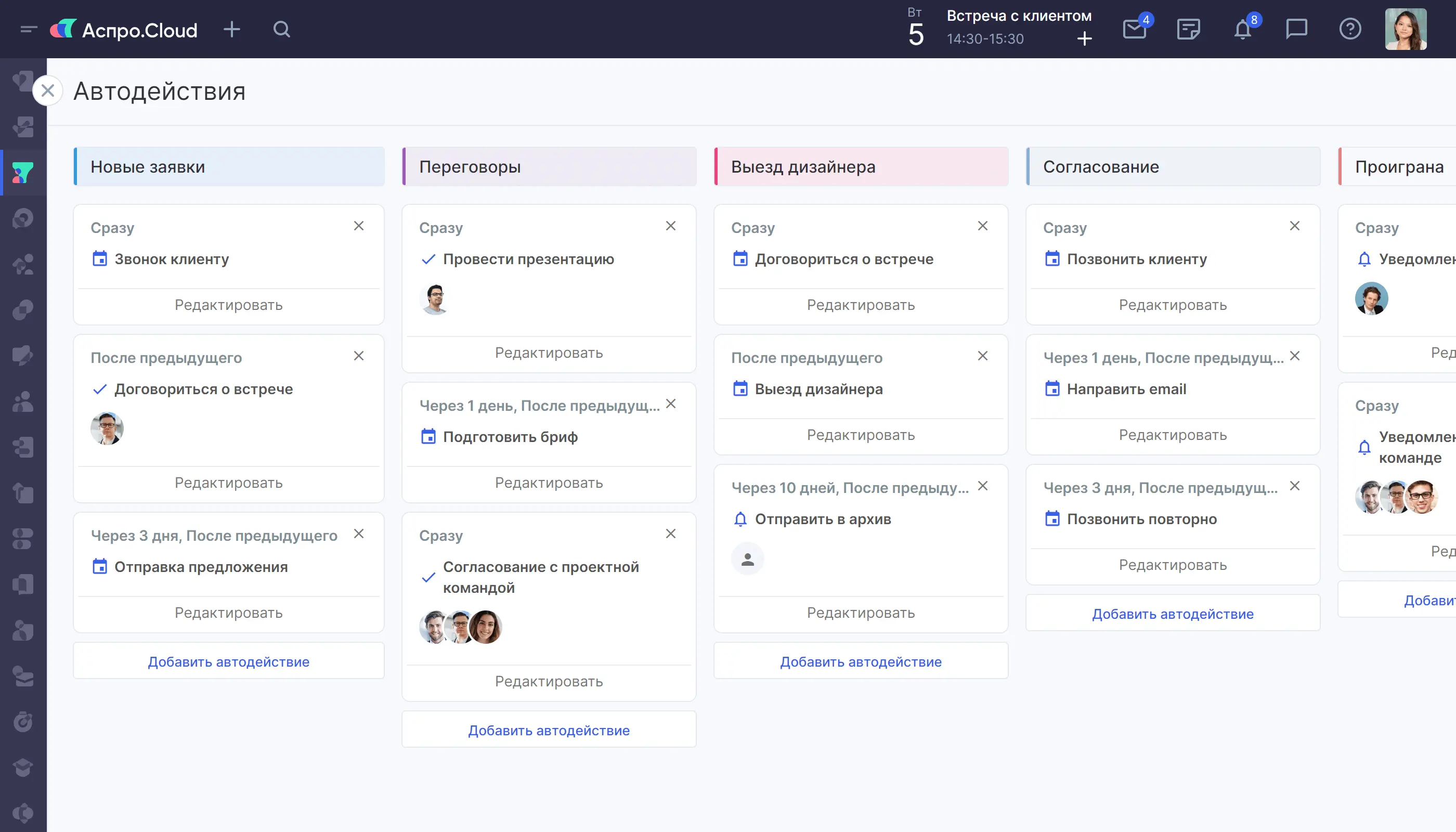 При поступлении нового заказа создание проекта занимает секунды. Все задачи автоматически получают нужных исполнителей, и команда может сразу приступать к работе.