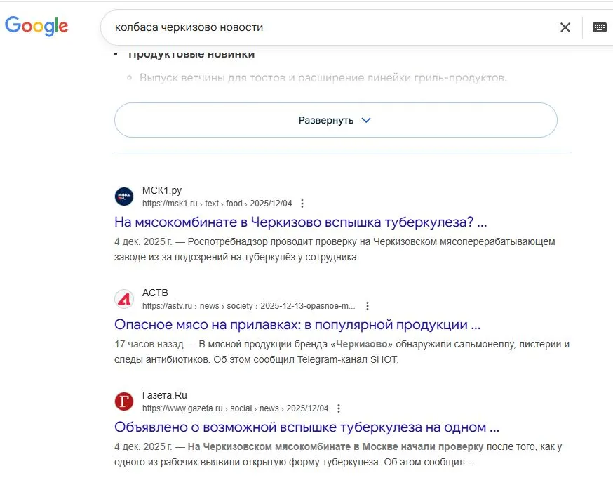 Пример. В свете последних событий по запросу «колбаса черкизово новости» поисковик первым делом выдает список новостей, рассказывающих о якобы вспышке туберкулеза на производстве.