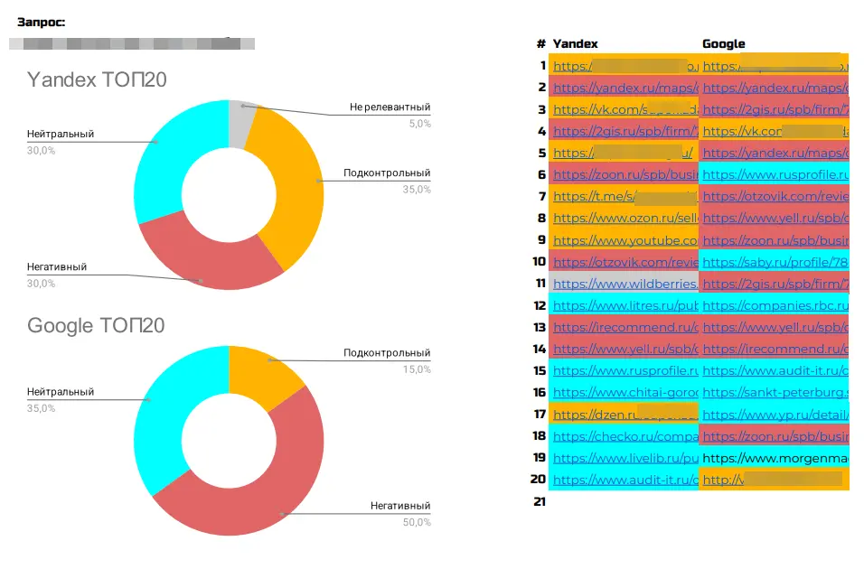 - Анализ: составьте список ключевых запросов, по которым негатив попадает в топ выдачи, и проанализируйте главные проблемы.