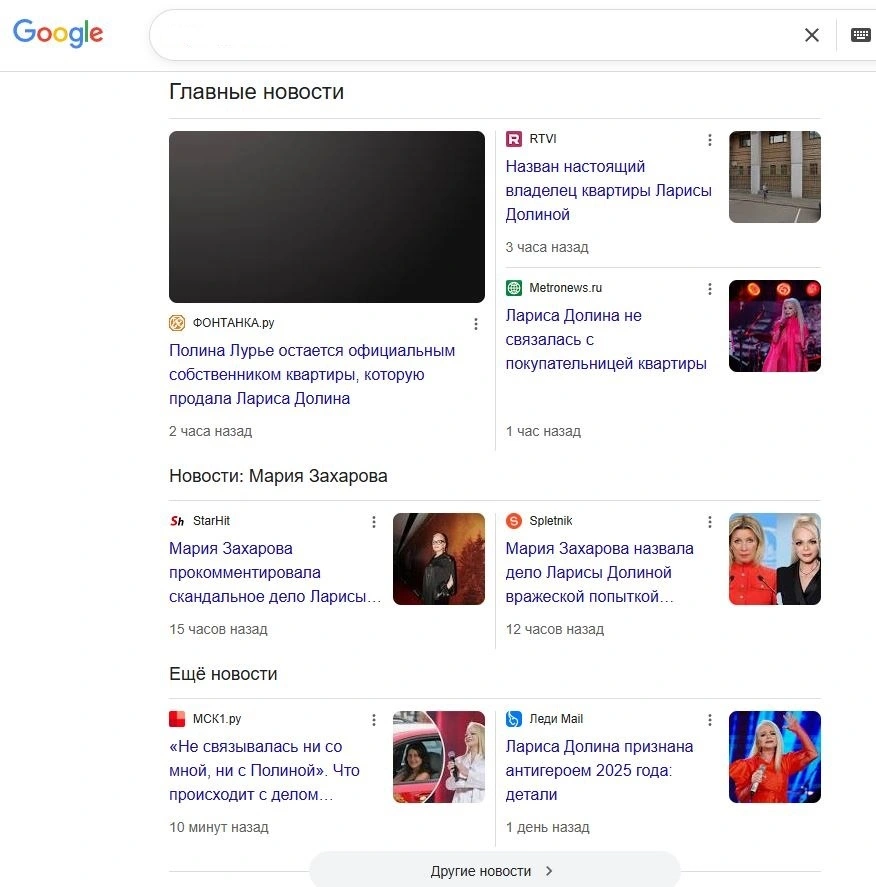 Пример. Если поискать в данный момент информацию по запросу «Лариса Долина», то первые страницы поисковика выдадут множество ссылок на скандальную историю, связанную с продажей ее квартиры. Напомним, артистка продала свою квартиру, но затем решила ее вернуть через суд, из-за чего на неё обрушилась волна хейта в соцсетях и СМИ.