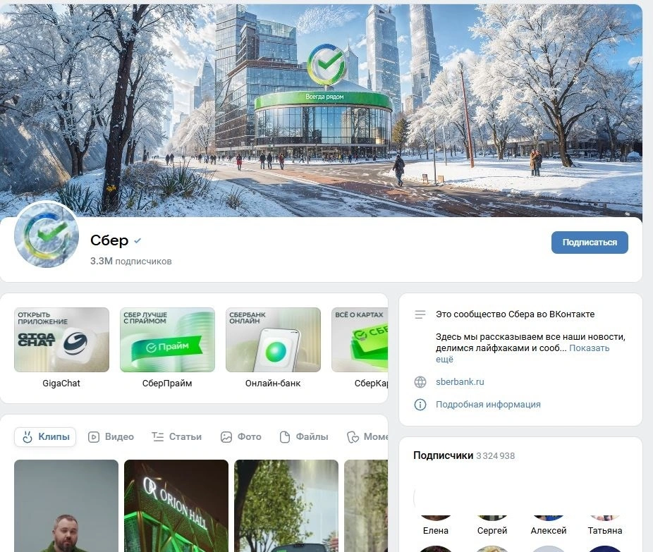 Пример. Страница Сбера в ВК: аккуратно оформлена, регулярно обновляется, на ней присутствуют необходимые контакты, а на стене каждый день появляются новые посты.