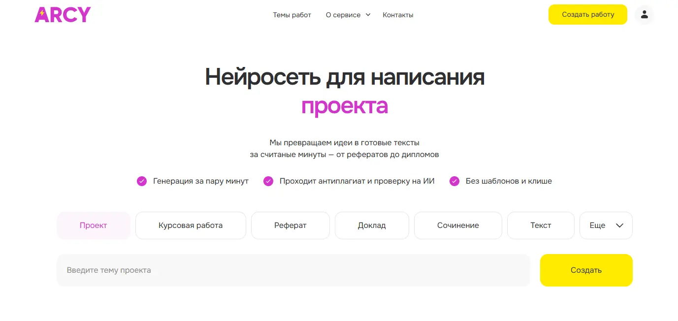 Arcy предлагает: автоматическое создание текстов учебных работ (проект, курсовая, реферат, диплом) с помощью нейросети, включая оформление по ГОСТу.