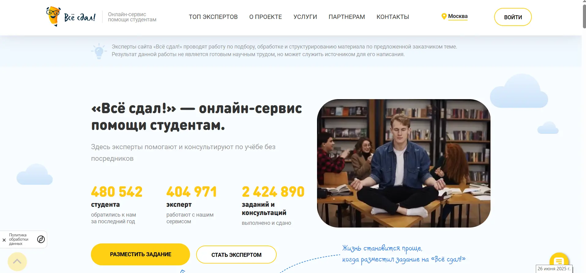 Что предлагает: написание учебных работ, справочные материалы и персональное сопровождение для студентов по более чем 200 дисциплинам.