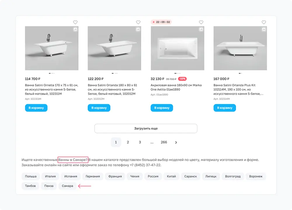 Под каждым списком товаров добавили SEO-описания с тегами, ведущими на специализированные посадочные страницы. Создали отдельные посадки для продвижения в других регионах и для товаров конкретных производителей.