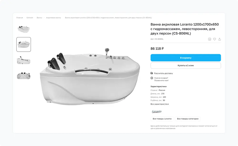 Карточки товаров получили крупные изображения, подчеркивающие эстетику сантехники. Добавили возможность быстрой покупки в один клик и калькулятор стоимости доставки.
