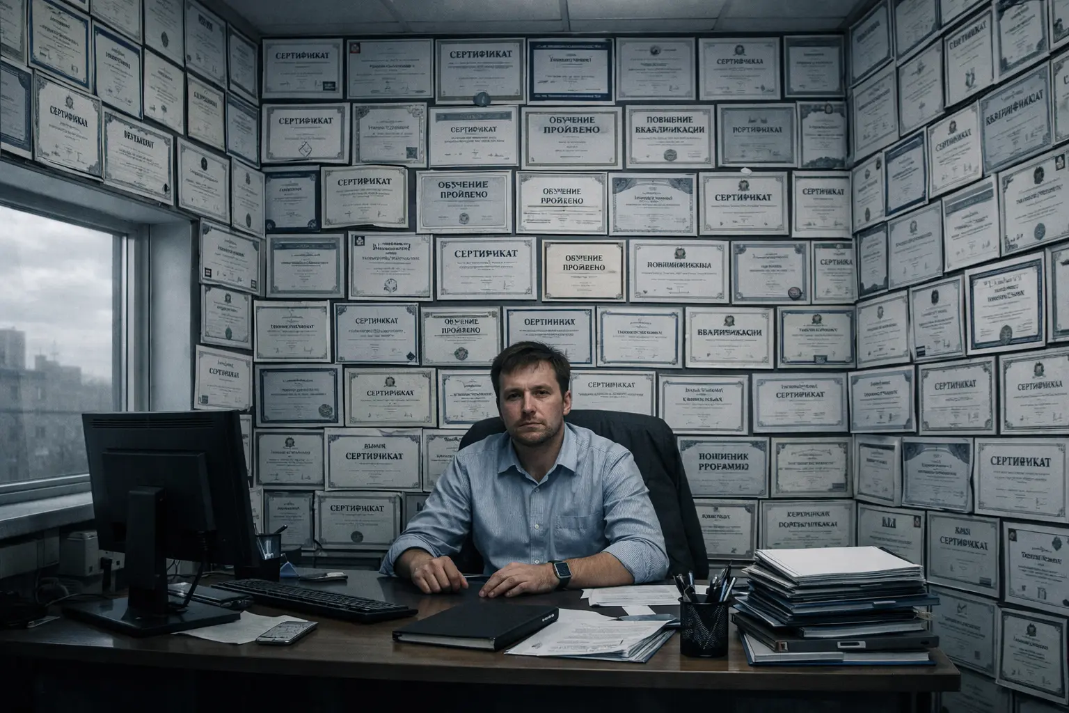 Корпоративное обучение — отдельная комедия. HR объявляет программу развития, менеджеры делают вид, что конспектируют, тренер делает вид, что учит. Единственная польза — нетворкинг на кофе-брейке. Эффект никто не меряет: максимум — анкета «понравилось/не понравилось». На бумаге всё идеально: «обучено сотрудников — 120 %», «сертификатов — 300». Метрики есть, но они измеряют не знания, а самоуспокоение.