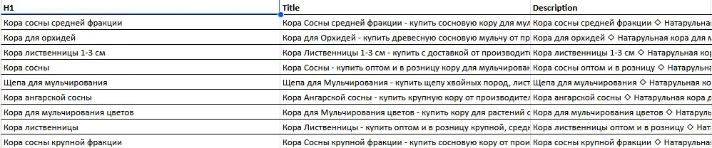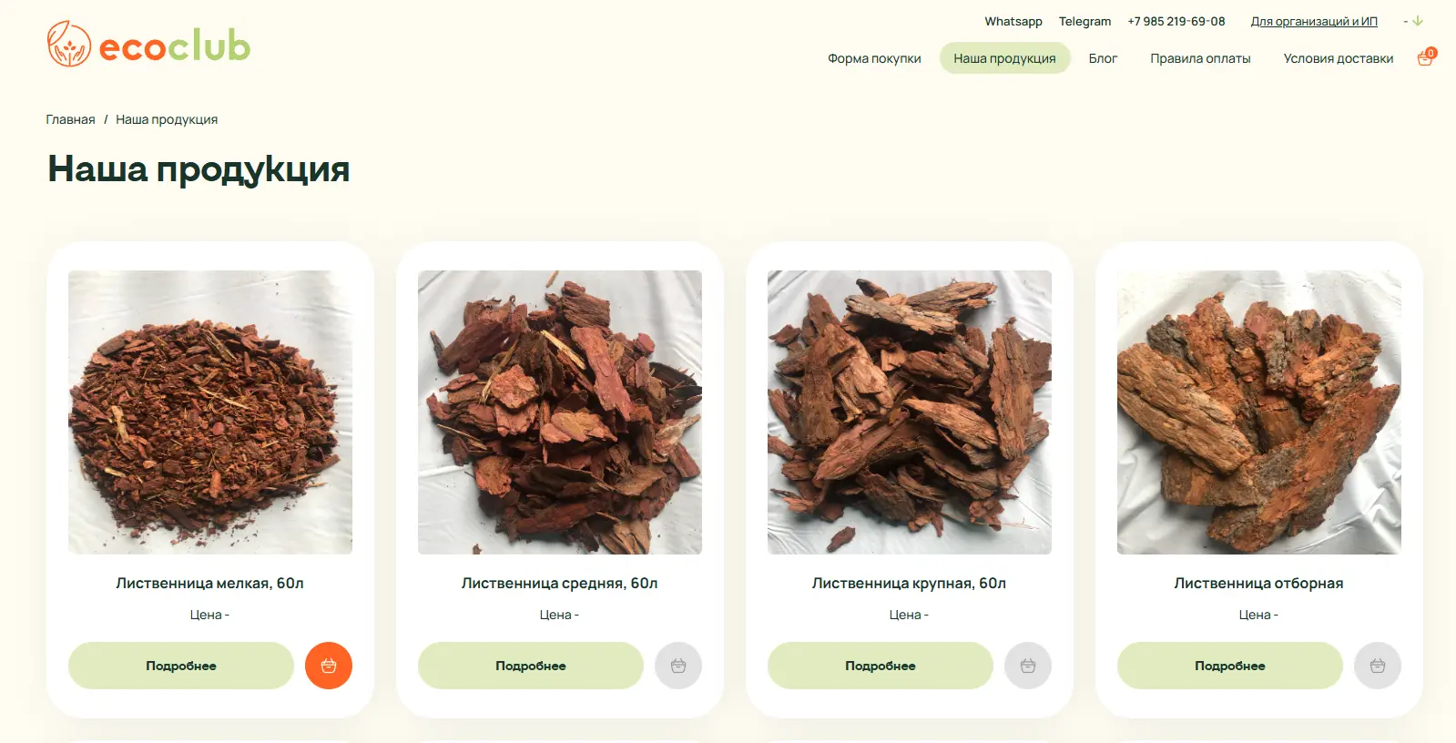 - Отсутствие структуры каталога. На сайте не было страниц под отдельные товарные группы, такие как "кора лиственницы", "кора сосны", "мульча фракции 10–20 мм" и т.д. Все товары свалены в общую категорию, без сегментации — что делало невозможным продвижение по большинству коммерческих запросов.