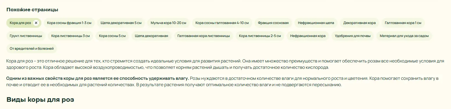 Мы также создали отдельные страницы под геозапросы, например, “Купить кору лиственницы в Москве с доставкой”, чтобы собирать трафик по региональным уточнениям.
