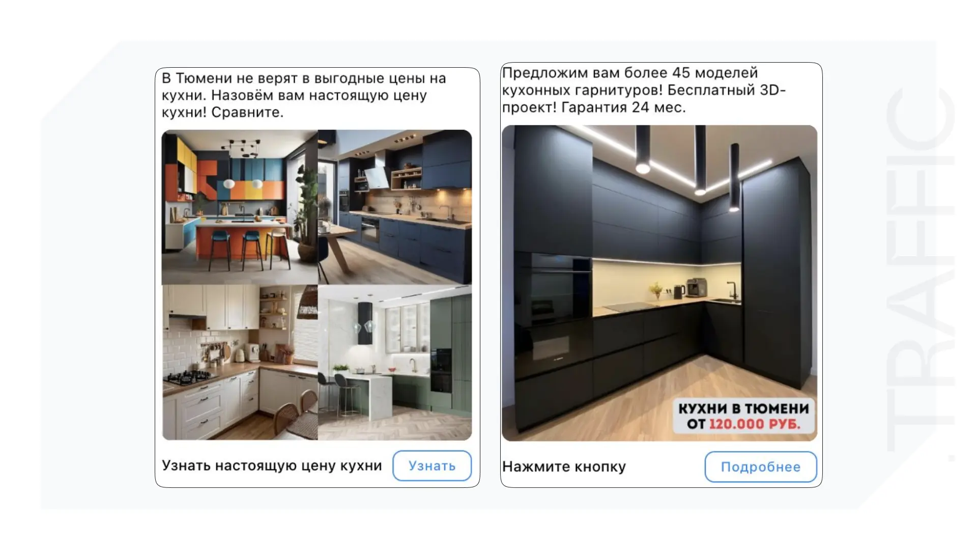 • В качестве сбора заявок тестировались и использовались различные лид-формы. Хорошо себя показал оффер с дизайн-проектом и с каталогом разных ценовых комплектаций. Человек отвечал в лид-форме на вопросы о своей будущей кухни и таким образом сразу квалифицировался. В дальнейшем лид-формы оптимизировались и в них также добавлялись акции.Лучшие лид-формы :