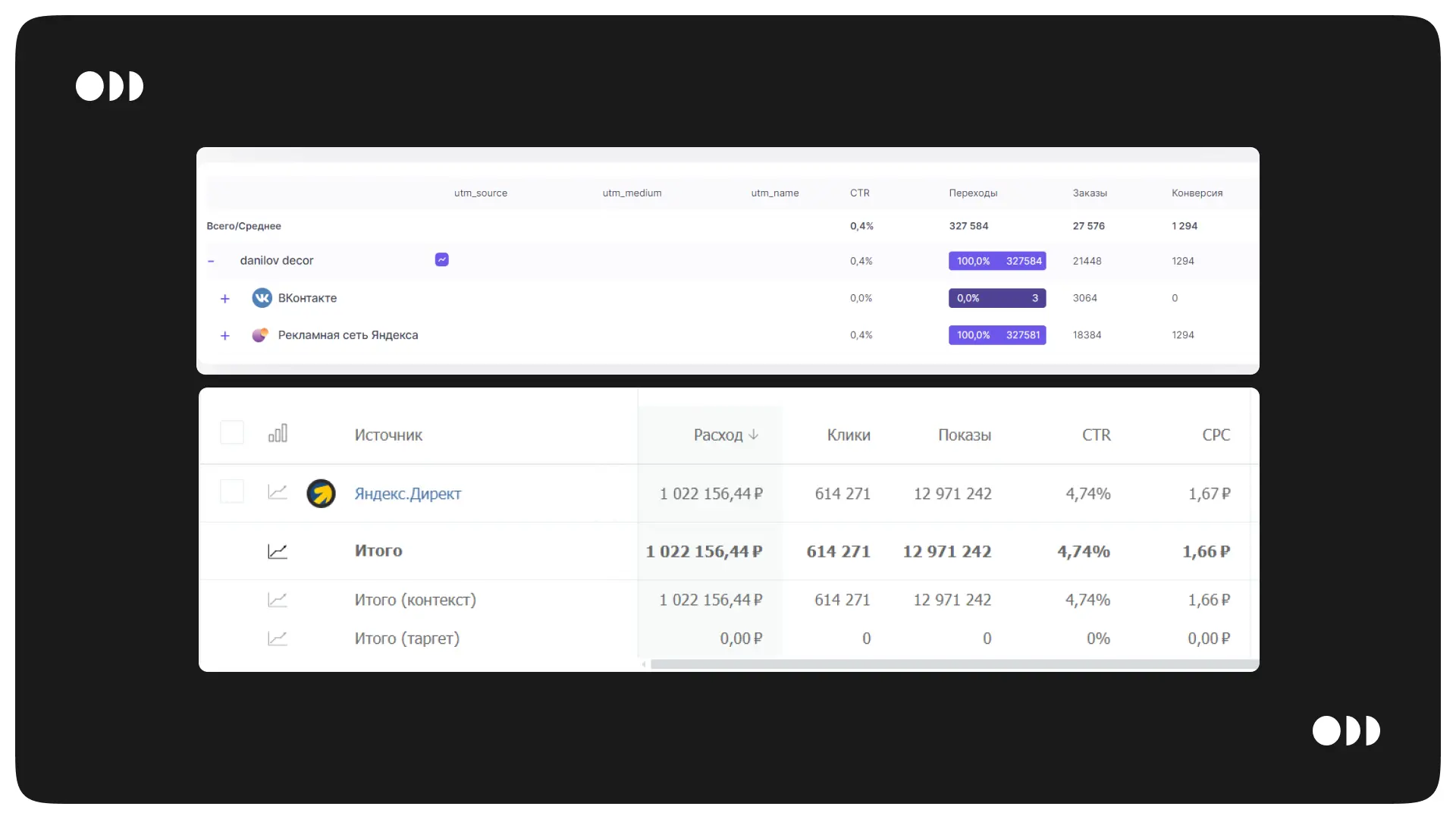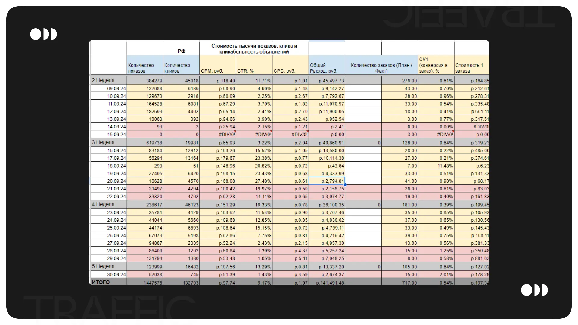 В отдельных столбцах высчитывается стоимость 1 заказа и прибыль. В конца каждого месяца автоматически высчитывается ROMI, что позволяет держать руку на пульсе и удобно для собственника и фин. директора компании клиента.