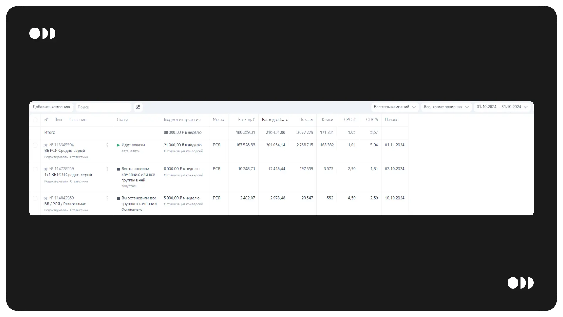 На старте проекта в работу были запущены 2 кампании, ЕПК на РСЯ и Поиск. С первых же дней кампания на РСЯ дала потрясающие результаты: цена клика доходила до 1 рубля, а CTR превышал 6%. За октябрь месяц суммарно было потрачено 216 тыс. рублей и получено около 1300 заказов.