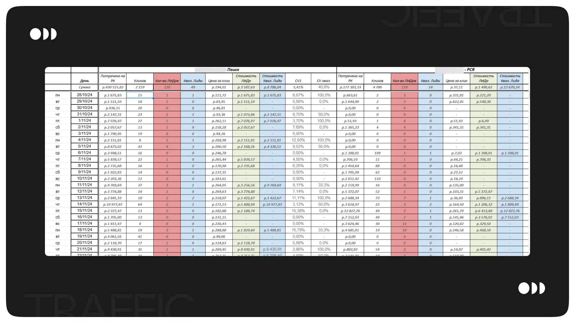 С клиентом была согласована таблица отчетности, которая отражала ключевые показатели. Таблица разбита на 2 части - Поиск и РСЯ, чтобы наглядно отражать эффективность каждого плейсмента.