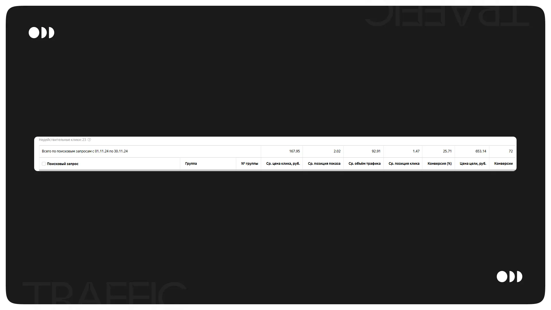 Проведя анализ поисковых запросов и сформировав отчет по среднему объему трафика, позиции клика и позиции показа, мы увидели, что выкупаем практически весь трафик и занимаем лидирующие позиции по показам.