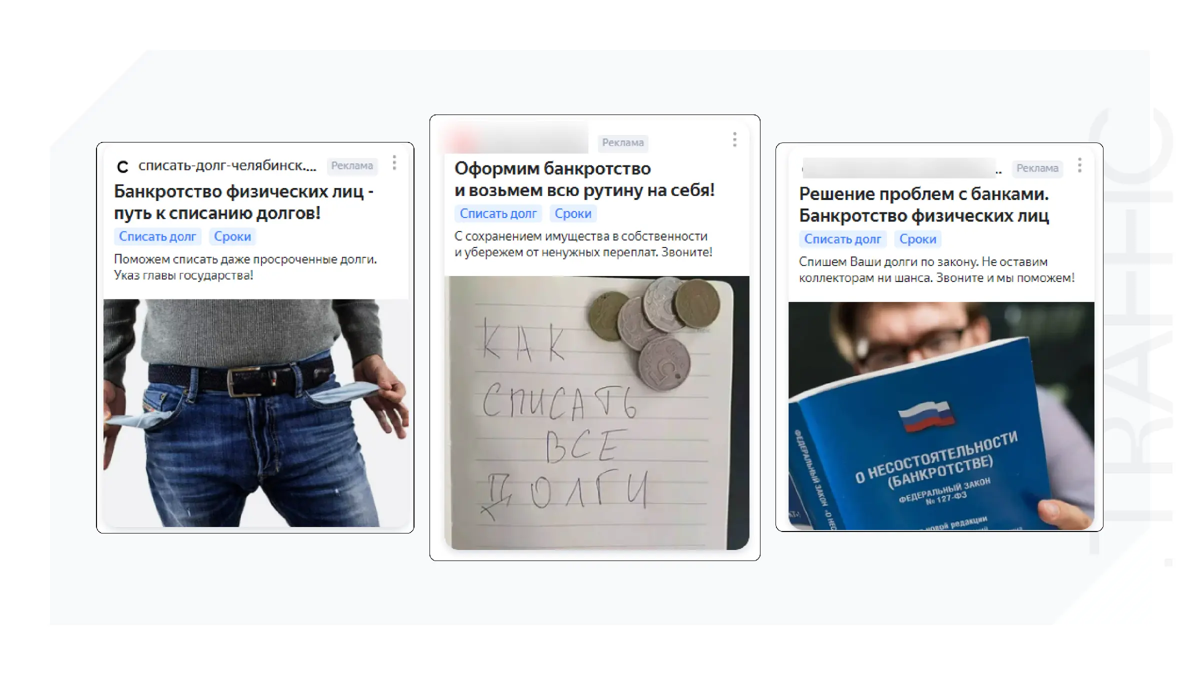 Низкая стоимость лида обусловлена тщательным сегментированием предложений для каждого населенного пункта, включая даже самые небольшие поселки. Объявления начинались с фразы: "В [название населенного пункта] жители активно начали списывать долги".