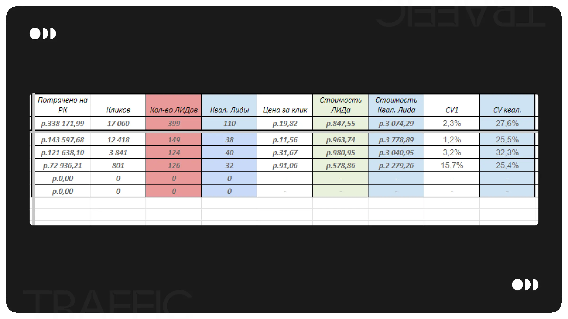 Итоговый отчет был сформирован на основе ежедневных показателей. Все данные из рекламных кабинетов заполняются автоматически. Некоторые показатели рассчитываются с использованием формул. Столбец "Квалифицированные лиды" заполняется клиентом, что позволяет нам анализировать стоимость таких лидов и конверсию из валовых лидов в квалифицированные.