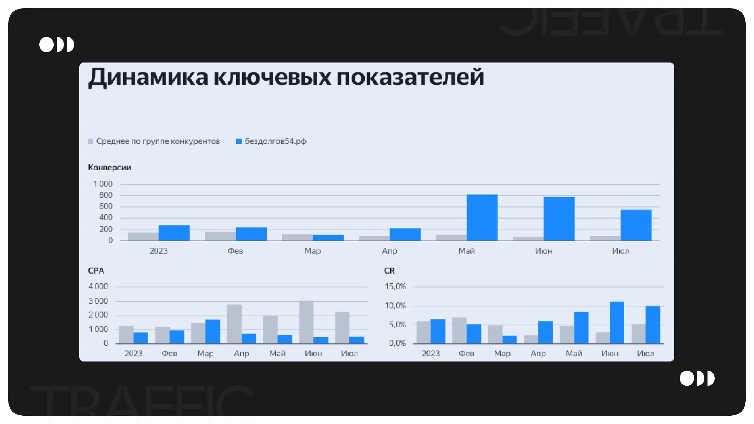После года работы мы повторно провели конкурентный анализ и получили ожидаемые результаты. При расходах на 20% ниже, мы привлекаем на 80% больше трафика по сравнению с конкурентами. Это свидетельствует о высоком качестве наших рекламных объявлений.
