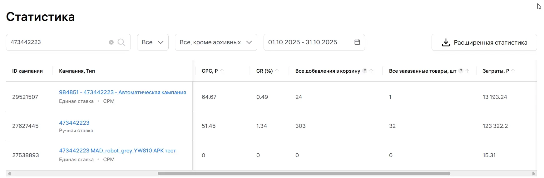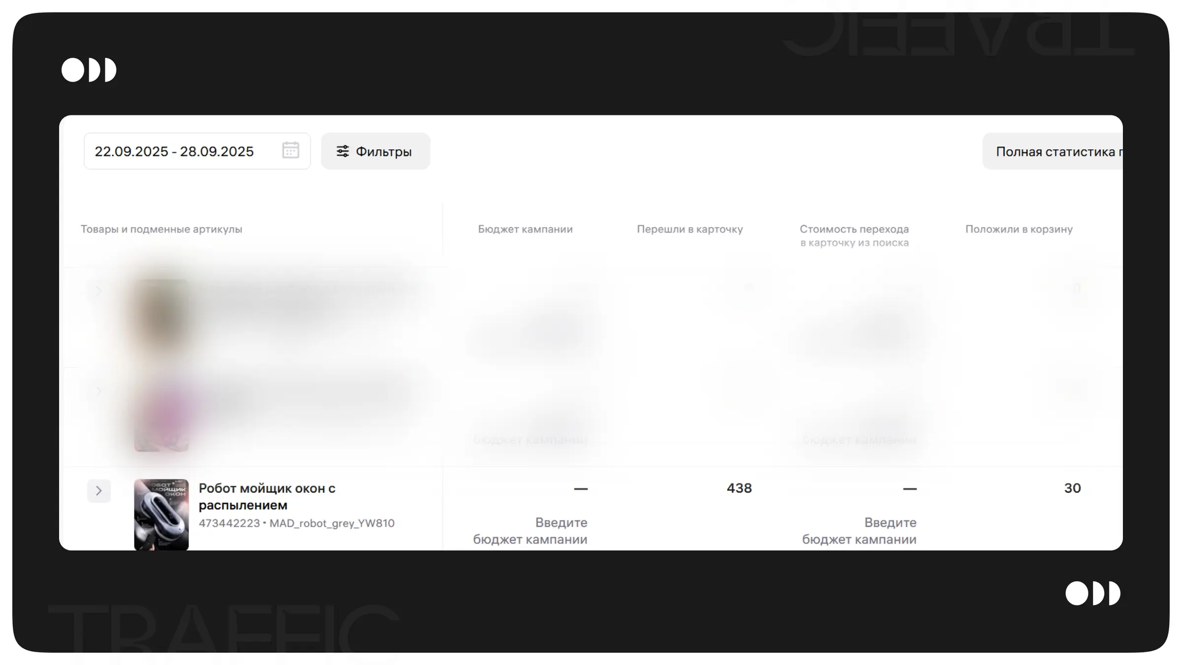 За первую неделю было потрачено 10 000 рублей, совершено 485 переходов в карточку товара по 20 рублей и 12 корзин по 839 рублей. Данные показатели были очень далеки от требуемых, и предстояла большая работа по оптимизации трафика.