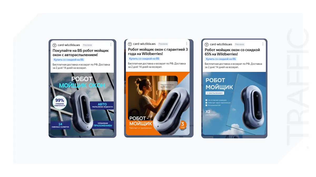 В качестве настройки таргетинга использовались ключевые слова, а если точнее, то коммерческие ключевые слова: «купить робот мойщик окон», «мойщик окон Валберис», «купить мойщик окон».