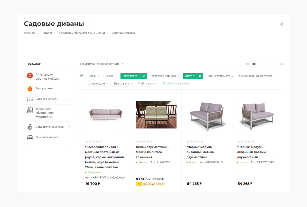 - Фильтры — по материалу, цвету, размеру, стилю, цене.