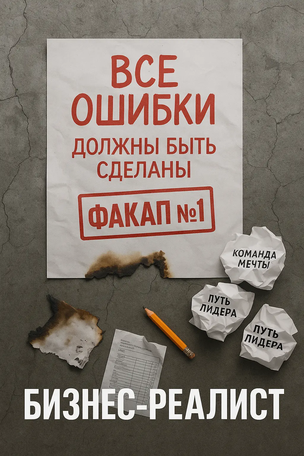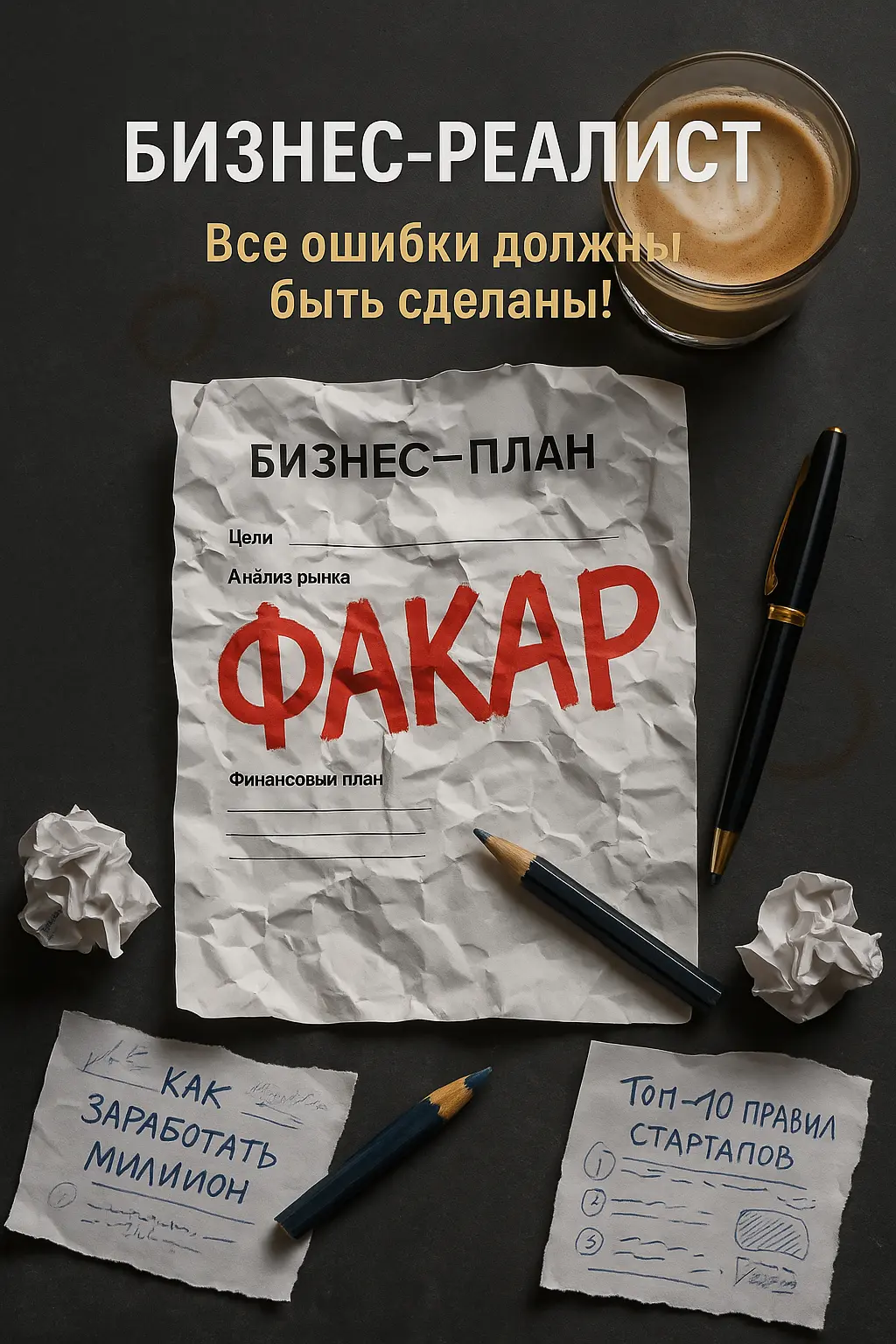 Первые 80 страниц А4 появились буквально за три дня, в феврале 2025. И название: «Бизнес-реалист. Все ошибки должны быть сделаны». (первые обложки с типичными косяками нейронок)