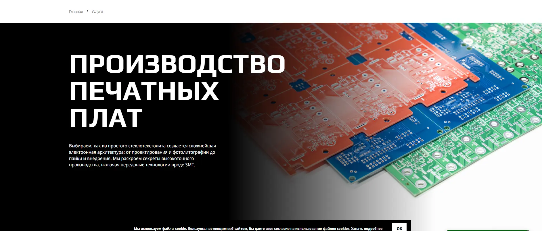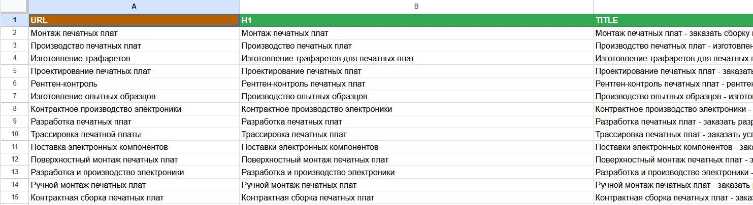Мы собрали семантическое ядро и увидели, что можно внедрить более 25 целевых услуг. Среди них: монтаж печатных плат, производство плат, поверхностный и ручной монтаж компонентов, прототипирование, контрактная сборка и другие. Эти запросы были максимально коммерческими и конверсионными - именно те, что приводят клиентов, а не случайный трафик.