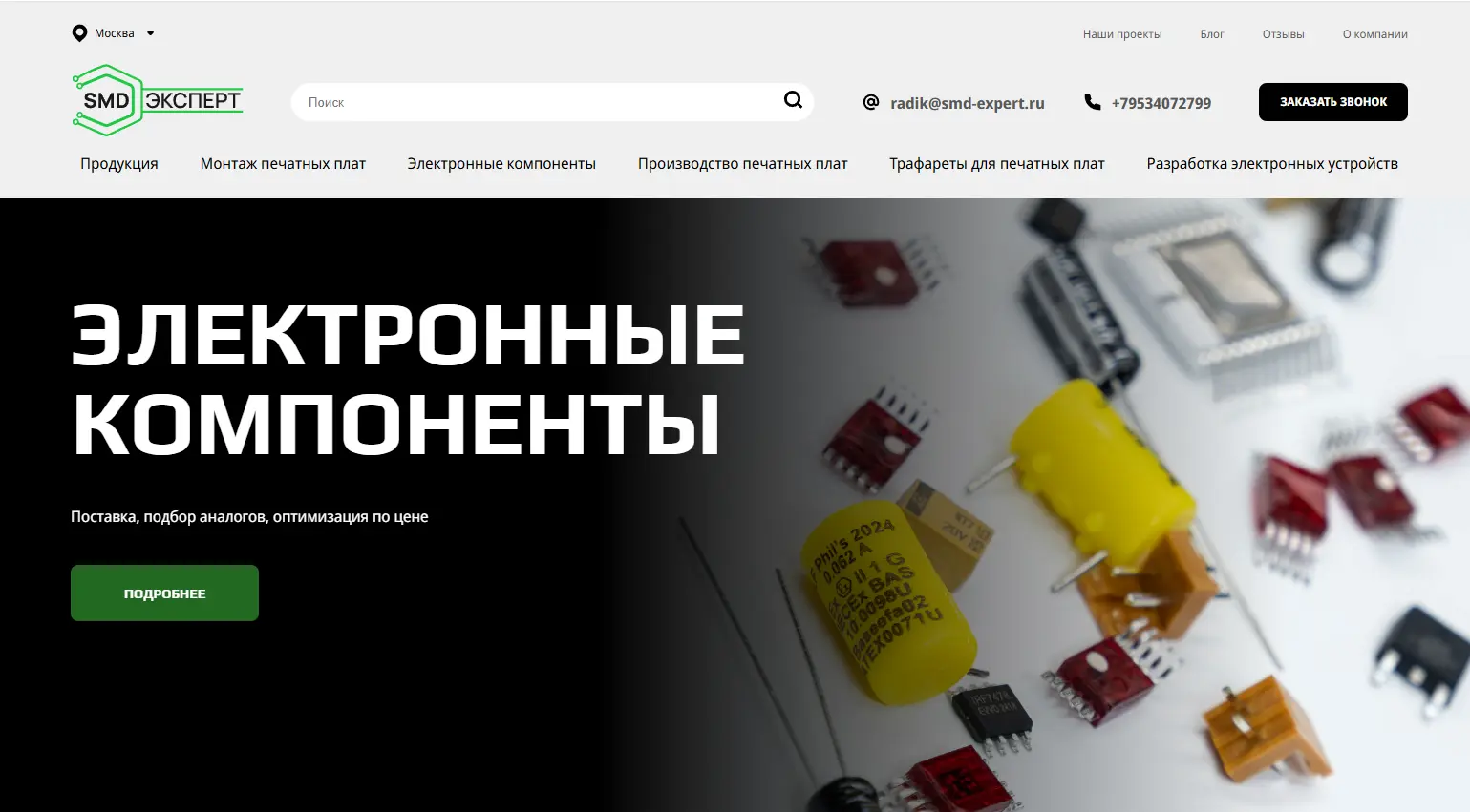 Проект smd-expert.ru пришёл к нам в апреле 2025 года. На тот момент сайт представлял собой минимальный набор страниц: главная и каталог продукции, который практически не приносил ценности в продвижении. Главная страница пыталась закрыть сразу несколько направлений - разработку электроники, печатных плат и монтаж компонентов, но по факту не раскрывала ни одно из этих направлений полноценно.
