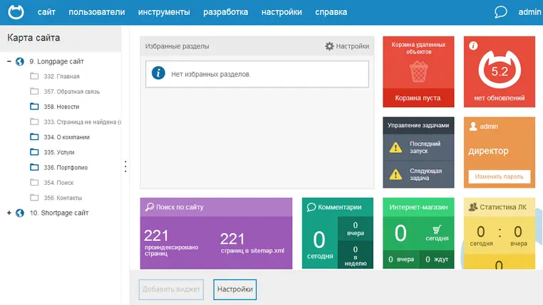 - SEO-настройки, включая редактирование метатегов, карту сайта, микроразметку.