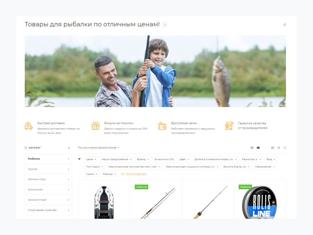 Основа рыболовного интернет-магазина — удобный каталог с детализированными карточками товаров. Рыболовы особенно тщательно изучают технические характеристики снастей, поэтому критически важны:
