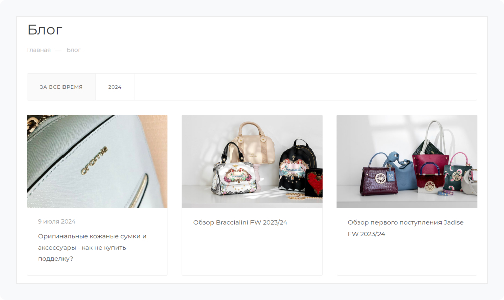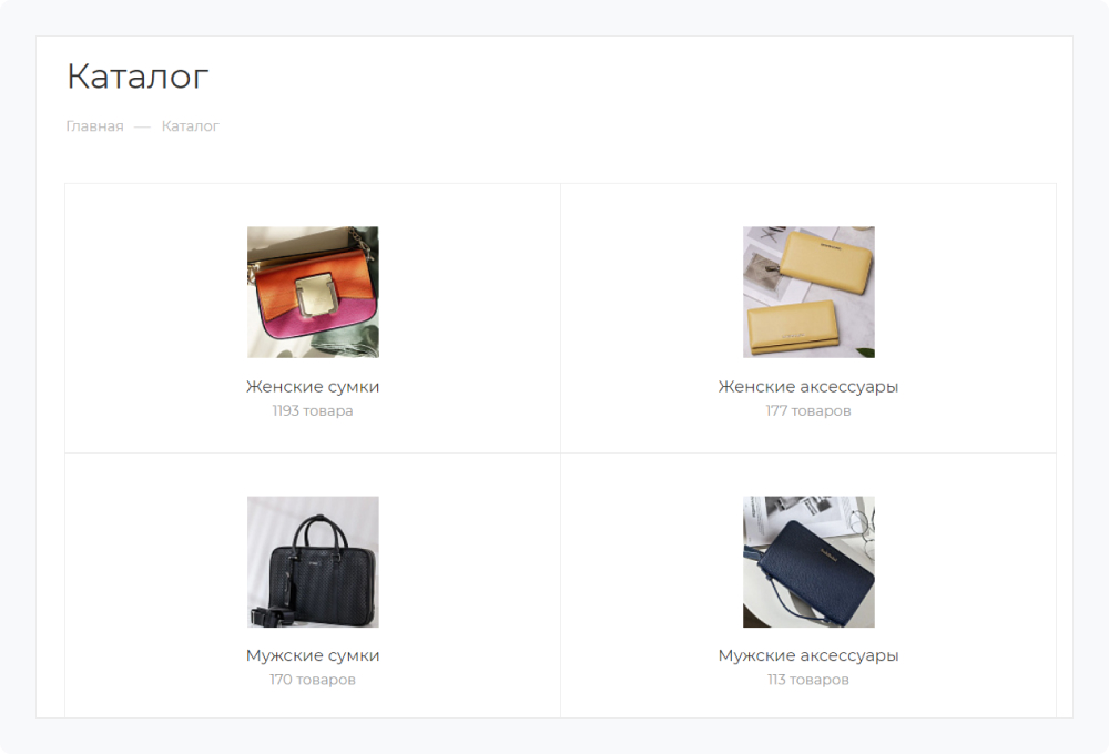 Создайте интуитивную навигацию с четким разделением по категориям: «Женские сумки», «Мужские аксессуары», «Детские товары». Каждая категория должна включать подкатегории по типу изделий.