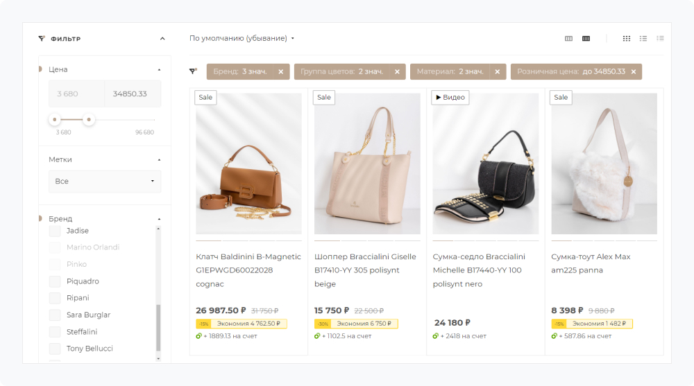 Продвинутые фильтры по цвету, материалу, бренду, цене значительно улучшают пользовательский опыт. Добавьте сортировку по популярности, новизне, стоимости.