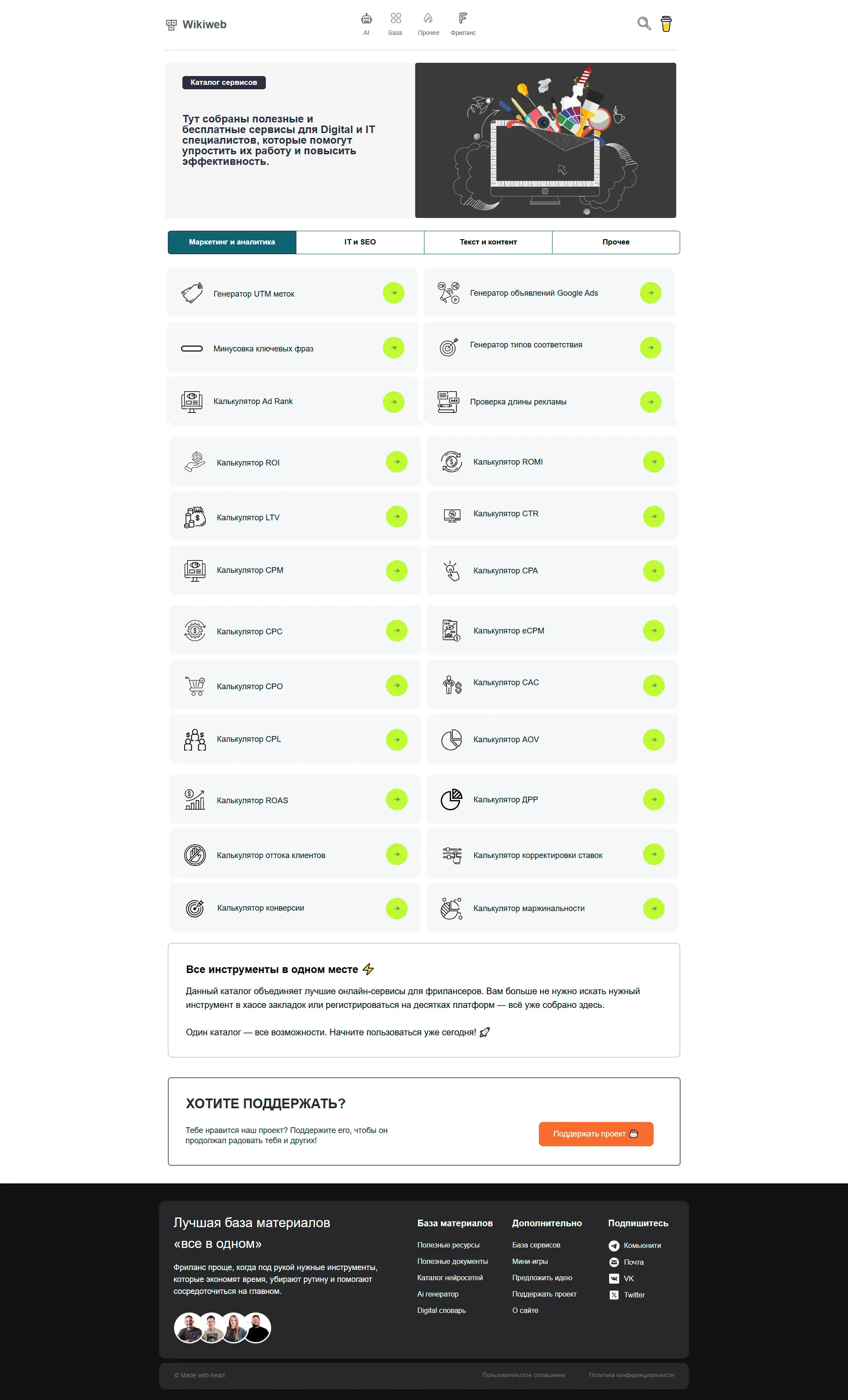 Так и появился Wikiweb — библиотека полезных ресурсов, которая в первую очередь помогает мне, а теперь и всем другим фрилансерам и digital-специалистам. Я собрал все те инструменты, которые использую сам: генераторы документов, нейросети для работы с текстами и изображениями, готовые шаблоны для быстрого старта.