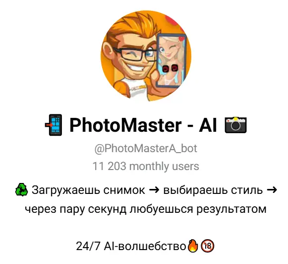 PhotoMaster - AI – люксовый бот раздеватор бесплатно, создающий фотореалистичные образы с идеальной детализацией: от текстуры кожи до анатомических нюансов.