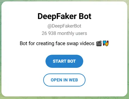 Описание: Telegram-бот для deepfake видео, специализирующийся на смена актёров в клипах с использованием глубокого обучения для точных подмен. Он предлагает мобильный доступ, делая процесс удобным на ходу. По моим тестам, бот выделяется скоростью в мобильной среде, идеален для быстрых правок видео, где важна портативность без потери детализации.