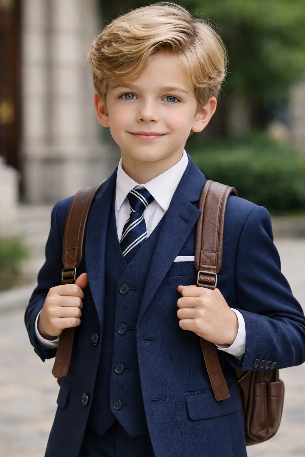 Повседневные и школьные варианты. В контексте школьной формы классический костюм также актуален. Многие школы требуют строгий стиль одежды, и костюм юного джентльмена в таком случае должен быть одновременно сдержанным и удобным. Часто используются костюмы темно-синего, серого или черного цвета, которые выдержаны в деловом стиле. Для меньшей формальности и большего комфорта некоторые родители выбирают вариант casual-стиля: например, пиджак спортивного покроя, который не сковывает движений, можно надеть с классическими брюками или даже джинсами. Такой образ более расслаблен и подходит для менее официальных мероприятий, сохраняя при этом элемент нарядности.