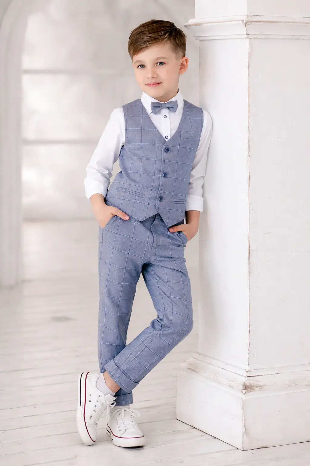 - Выбор цвета и узора. Как уже отмечалось, универсальными цветами для мальчикового костюма считаются темно-синий, серый и черный – они подходят практически для любых случаев и легко комбинируются с рубашками и галстуками разных оттенков. Если хочется разнообразия, можно обратить внимание на благородный бордовый или коричневый цвет костюма – такие тоже смотрятся стильно, хотя и менее универсальны. Яркие цвета (например, белый, ярко-синий, изумрудный) или принты (клетка, тонкая полоска) обычно используют для модных образов или тематических мероприятий. Если костюм нужен как школьная форма, лучше избегать кричащих расцветок и остановиться на классике. Рубашку к костюму обычно надевают однотонную светлую (белую, голубую) для торжеств, или пастельных оттенков в повседневном варианте. Галстук или бабочка подбираются в тон костюму либо контрастные (например, бордовый галстук к серому костюму).