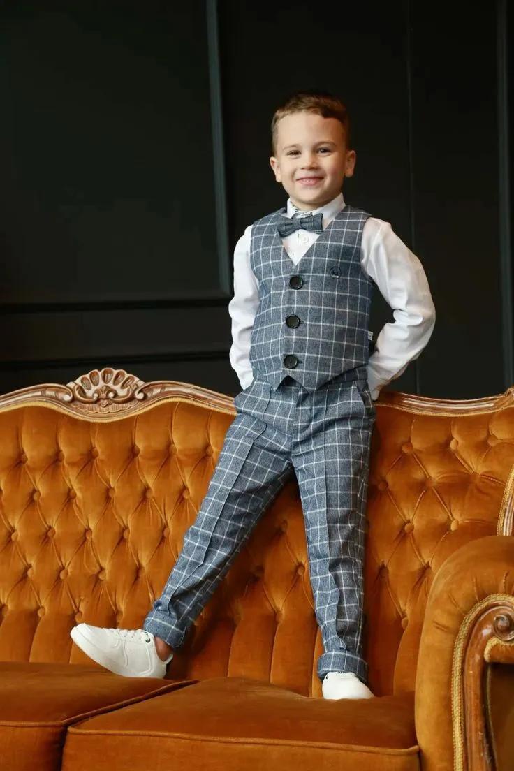 Костюм-тройка. Более формальный вариант – костюм-тройка, дополненный жилетом. Жилет надетый под пиджак добавляет образу торжественности и классического шарма. Костюм-тройка часто выбирается для особых случаев: свадеб, выпускных и других мероприятий, где требуется особенно нарядный вид. Темно-синий или черный костюм-тройка с белой рубашкой и галстуком выглядит на мальчике очень элегантно и «по-взрослому».