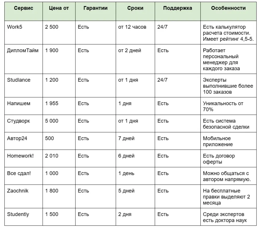 Каждый из перечисленных сервисов давно присутствует на российском рынке и успел завоевать доверие множества студентов благодаря качественному обслуживанию, профессиональному подходу и возможности заказать работы на выгодных условиях.