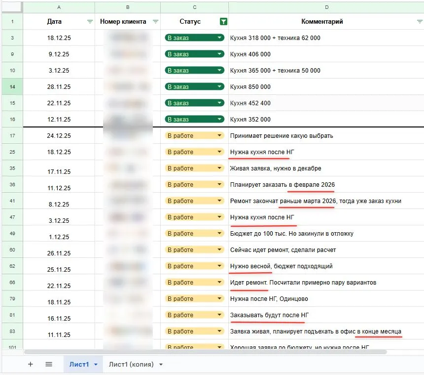 Производство кухонь – сфера, где часто встречается отложенный спрос и цикл сделки может занимать от двух недель до нескольких месяцев. Например, люди только начали ремонт квартиры, но мониторят цены на кухни, чтобы заранее спланировать бюджет. Получается, что клиент, который обратился к нам сегодня, может подписать договор, например, только через три месяца.