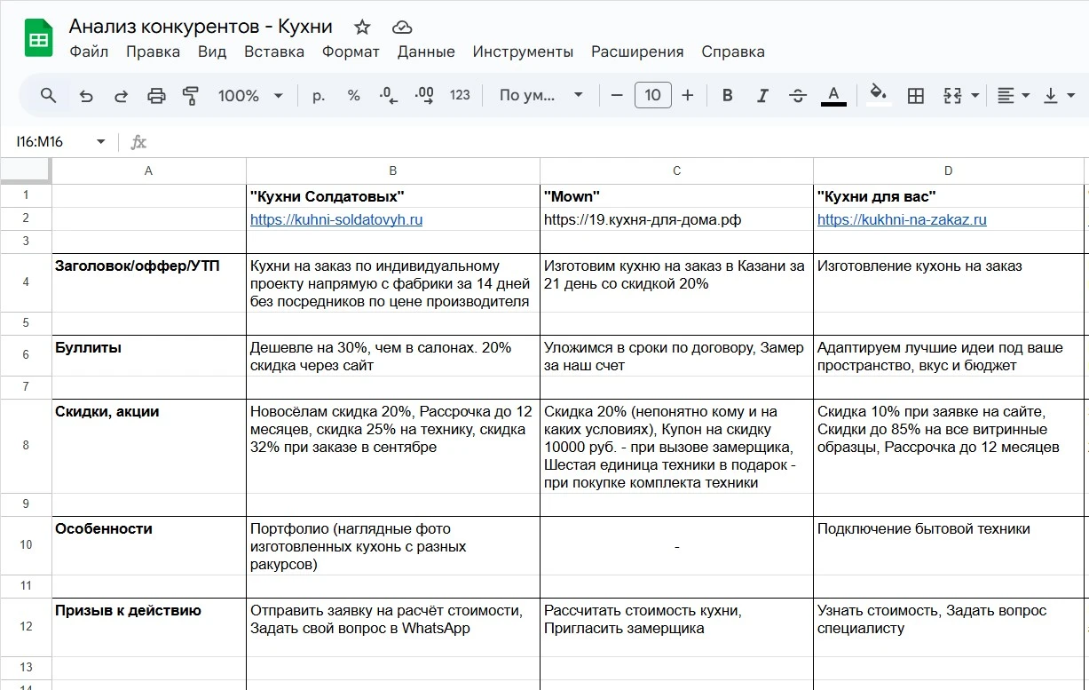 Анализ конкурентов - это неотъемлемая часть маркетинговой стратегии. Важно проанализировать их преимущества и недостатки, уникальные предложения, акции, слабые стороны и прочие элементы на посадочных страницах и в объявлениях, чтобы выявить их сильные и слабые стороны. В совокупности это даст идеи для создания собственных выгодных предложений, чтобы обойти конкуренцию. УТП и офферы у многих конкурентов похожие с одинаковыми предложениями для клиентов.