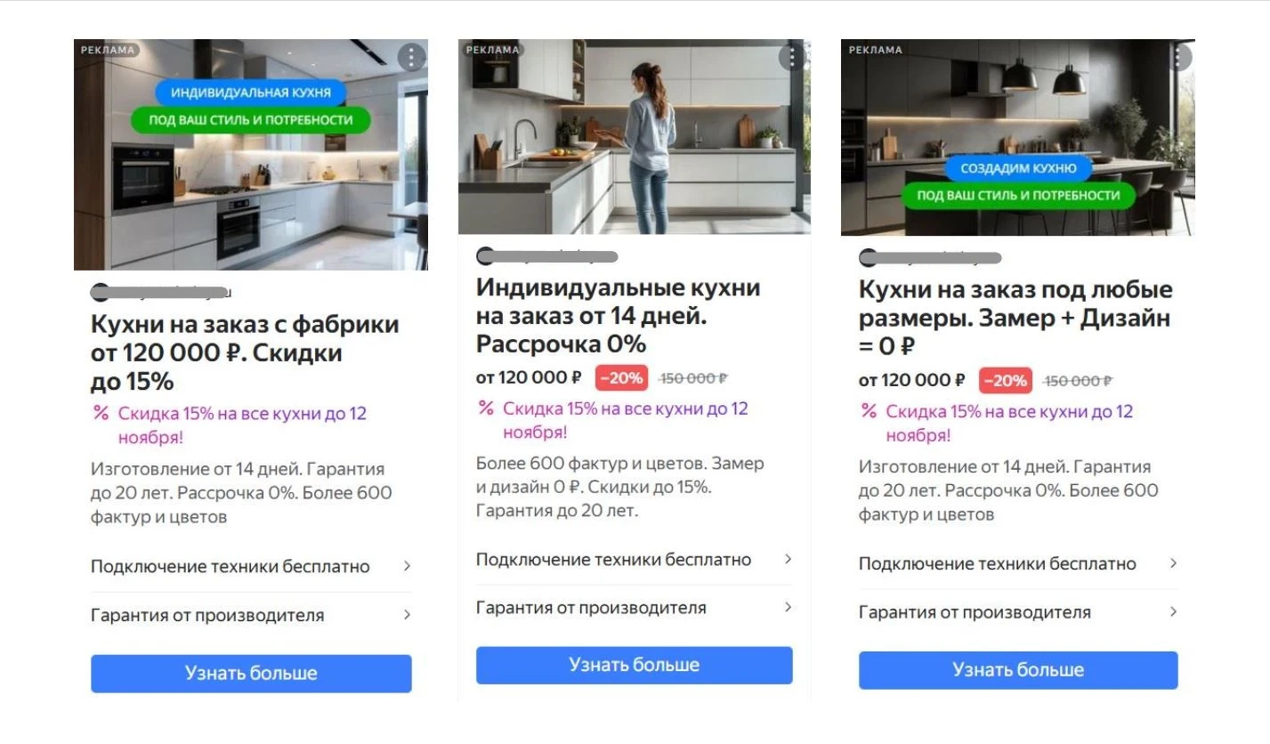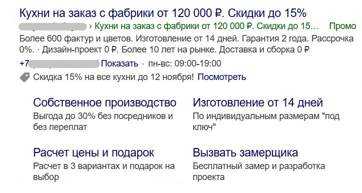 Объявления сформированы на основе преимуществ компании, то есть выделены выгоды, например, бесплатная помощь дизайнера, гарантии от производителя, акции и скидки и др. Также указана минимальная стоимость кухни, чтобы еще на этапе просмотра объявлений отсеять тех, кто ищет только бюджетные варианты, что позволяет экономить рекламный бюджет и время на обработку нецелевых заявок.