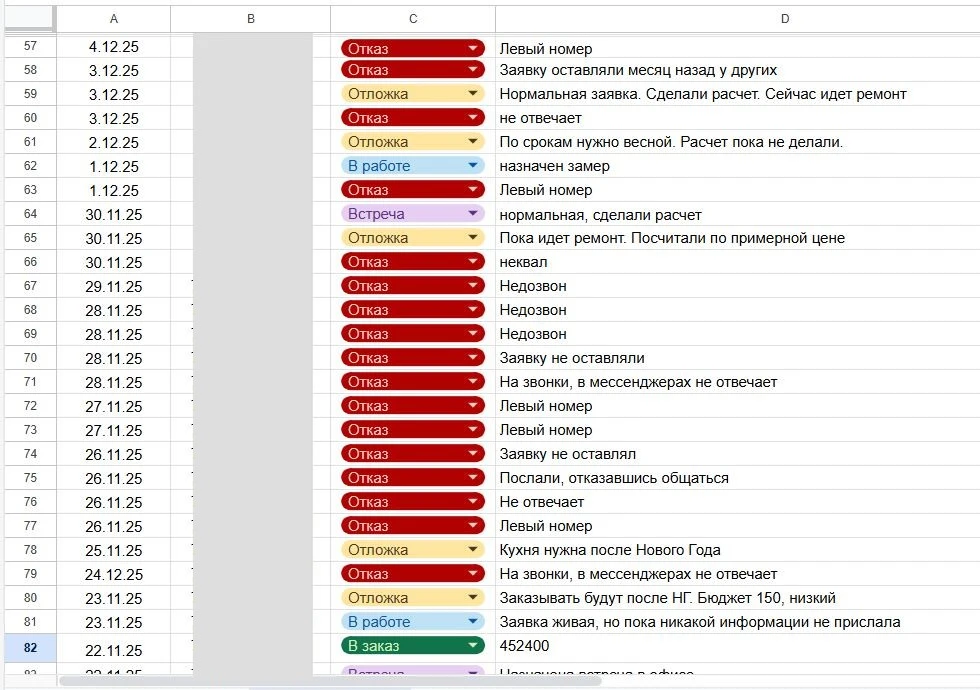💡 Стоит отметить, что среди полученных лидов также есть с отложенным спросом, например, кому-то нужна кухня после новогодних праздников, другим после ремонта, что говорит о возможности реализовать еще несколько продаж, увеличив выручку при текущих вложениях.