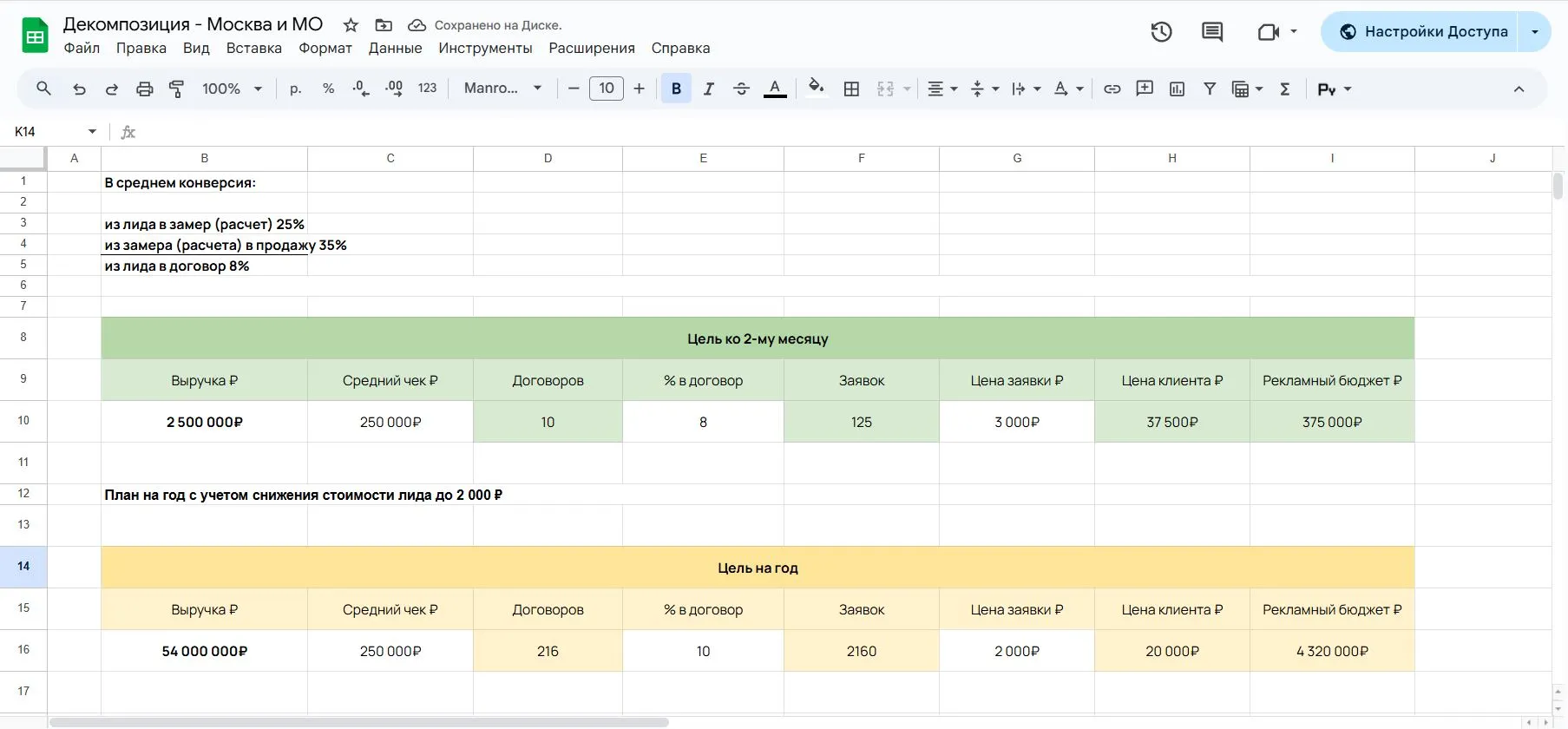 Из вводных данных лишь средний чек 250 000 р., то есть нужно 10 продаж. Цифр по продажам с рекламы нет, поэтому я промониторила рынок, провела анализ конкурентов и выяснила, что в среднем конверсия из лида в продажу 6-10%. Взяла для ориентира в среднем 8%, выполнила декомпозицию и вышло, что для достижения цели нужно примерно 125 лидов