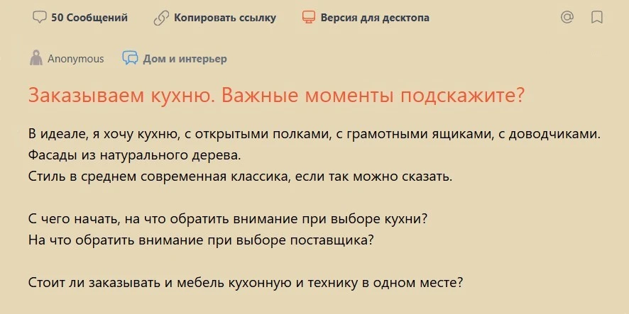 Информацию можно получить в отзывах у конкурентов, где люди пишут о том, что особенно им понравилось, а что, наоборот, вызвало негатив. Также есть различные форумы и сообщества в соцсетях, где потенциальные покупатели советуются между собой на тему покупки кухни.
