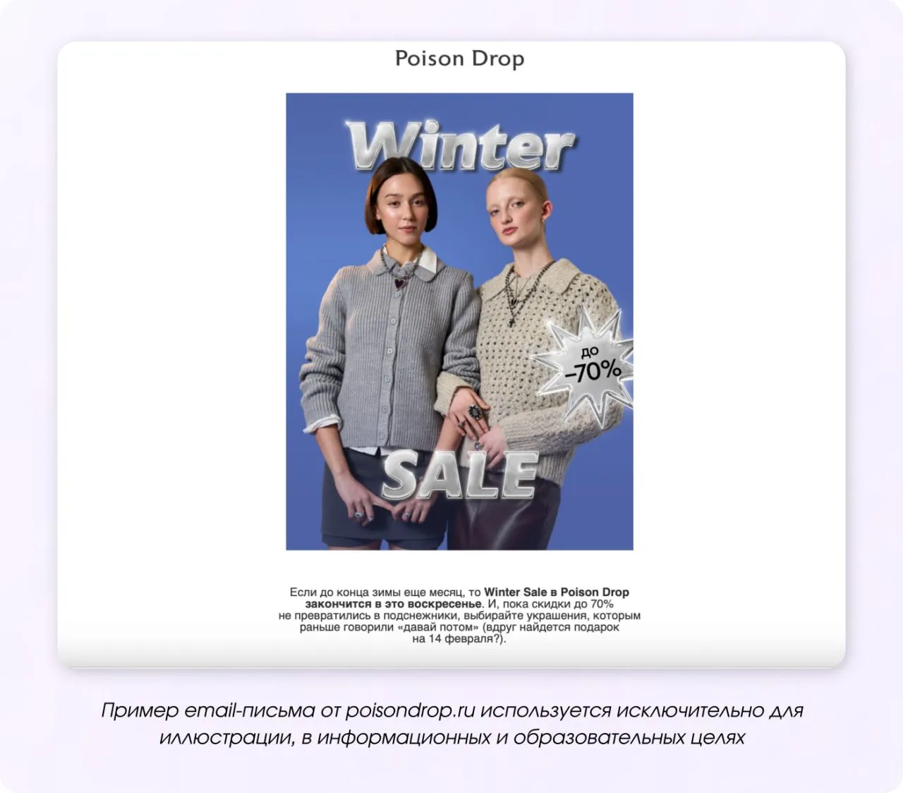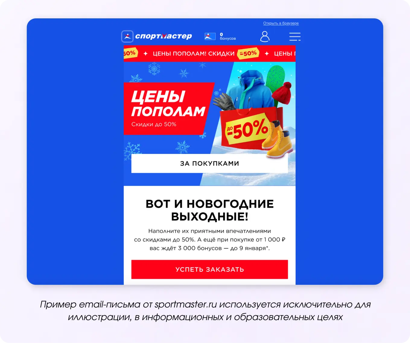 Поздравляем подписчиков с прошедшим Новым годом и радуем продолжением скидок. Плюсом будет то, что email-маркетинг и другие каналы в январе не так сильно загружены, как перед праздниками. Пока другие в спячке, пользуйтесь моментом и продолжайте продажи.