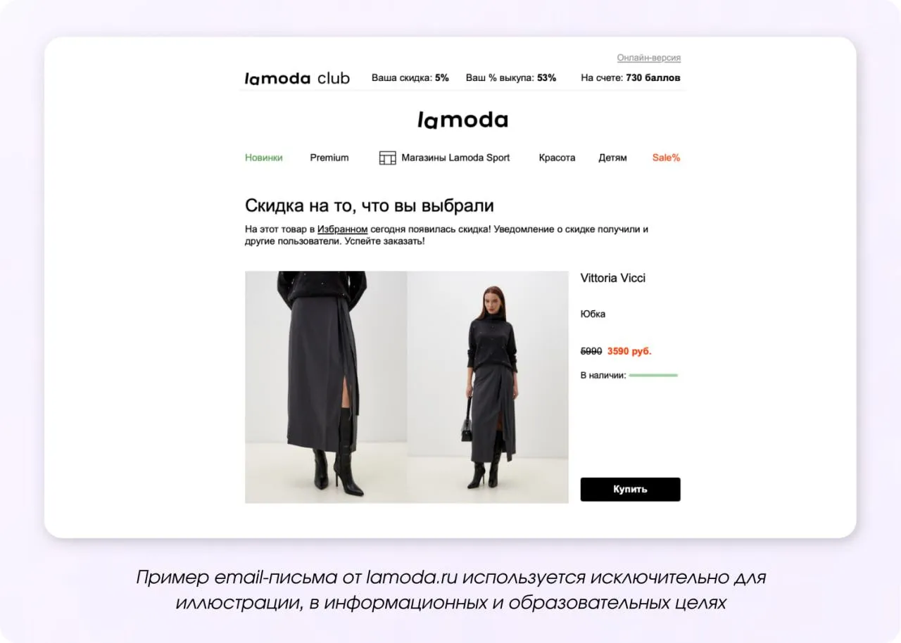 Опирайтесь на данные клиентов для созданияиндивидуальных предложений. Включайте в рассылки релевантные скидки, доступ к закрытым распродажам, купоны. Сделайте персональную подборку для конкретного человека на основе его предпочтений. Дарите подарки за лояльности или просто в тему праздников.