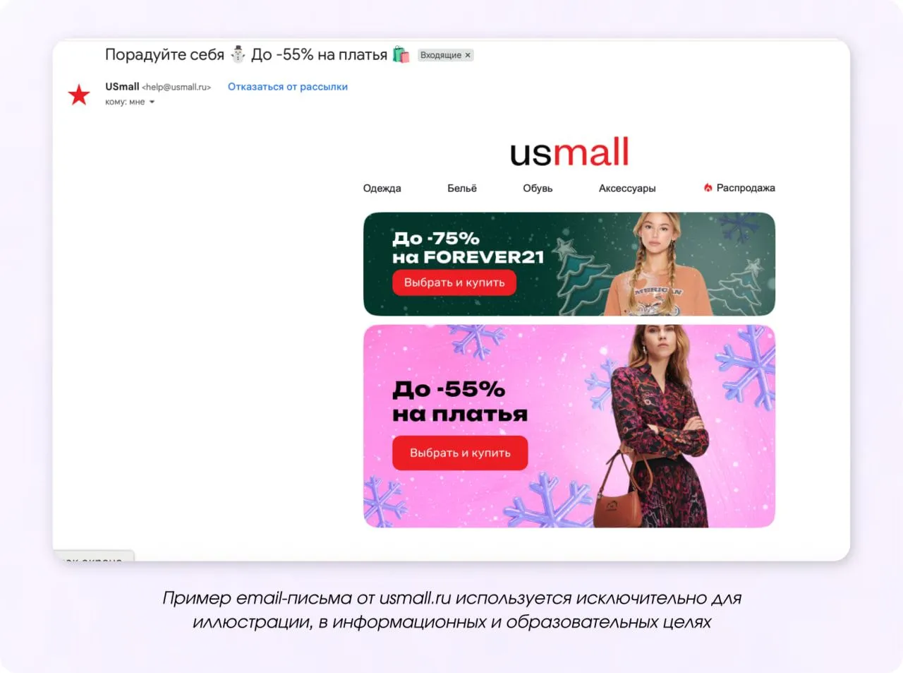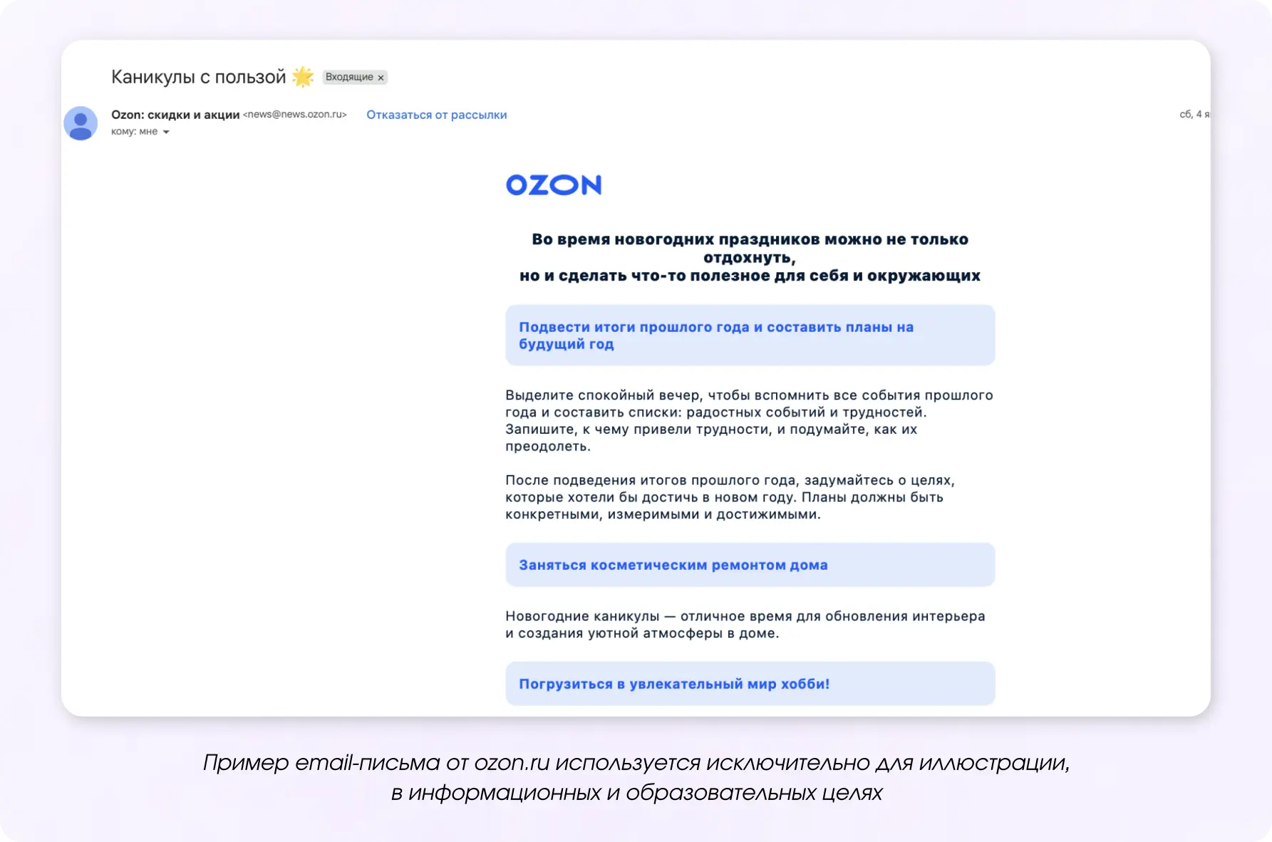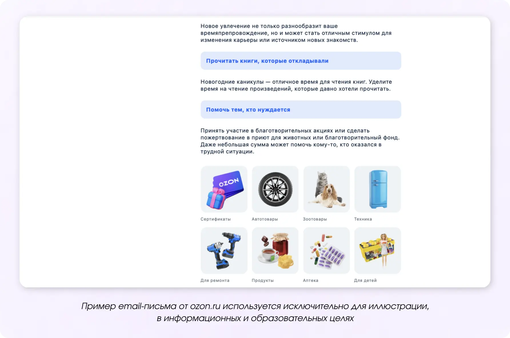 Кроме скидок, продолжения распродаж и бонусов используются конкурсы, челленджи, даётся возможность выгодного кредита или рассрочки. Также бренды делают рассылки с контентом на темы, которые волнуют подписчиков: как провести праздники, как вернуться в рабочий ритм и начать новую жизнь.