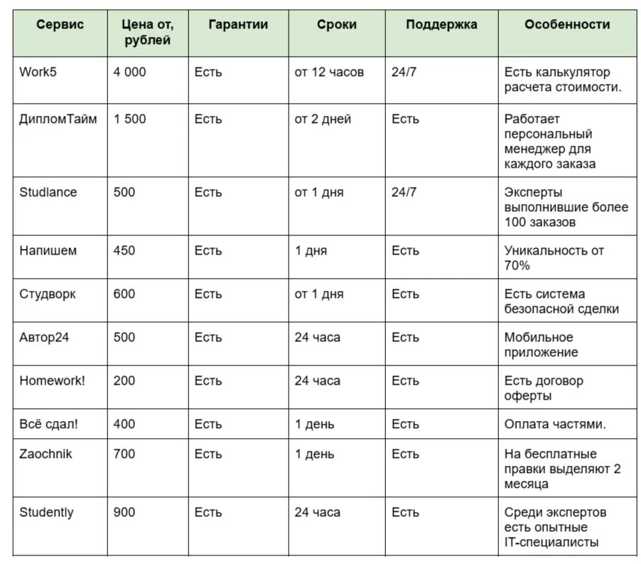 Каждый сервис подходит для разных задач: Homework и ДипломТайм — для сложных работ, Work5 и Studlance — для быстрых заказов, Zaochnik и Автор24 — для глубоких тем. Выбор зависит от бюджета, сроков и требований к уникальности.